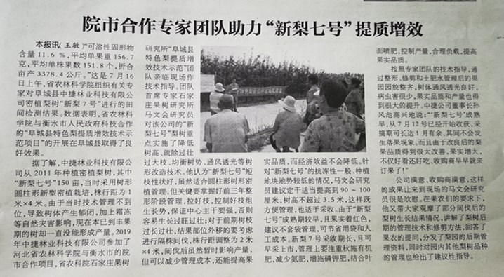 河北科技報2021年7月27日總第5448期第七版對我所衡水院市合作項目“阜城縣特色梨提質(zhì)增效技術(shù)示范”團隊赴阜城縣中捷林業(yè)科技有限公司舉辦的梨新品種及現(xiàn)場檢測觀摩會進行了相關(guān)報道。