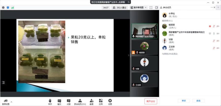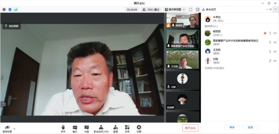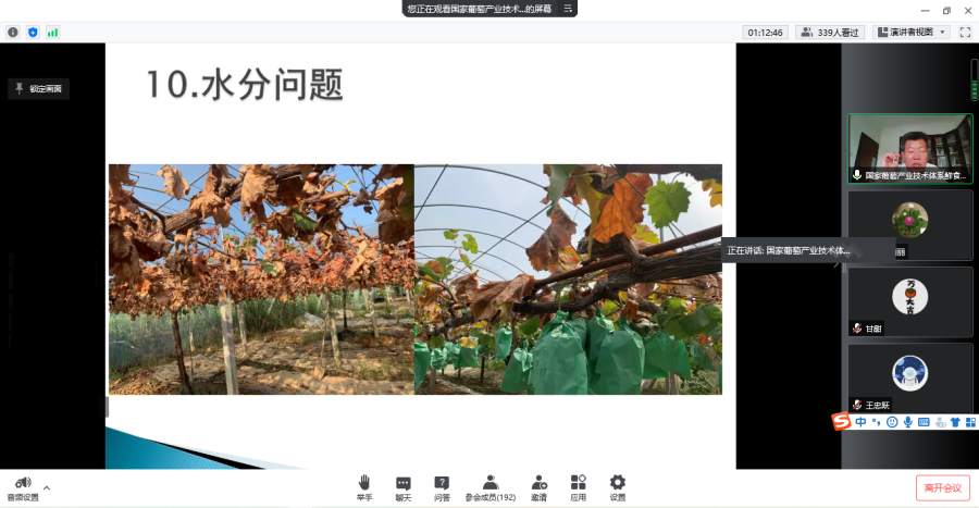 2022年5月31日,葡萄研究室成功舉辦了“設(shè)施葡萄優(yōu)質(zhì)、安全、高效栽培技術(shù)”網(wǎng)絡(luò)培訓(xùn)會(huì)。省農(nóng)業(yè)農(nóng)村廳特色產(chǎn)業(yè)處李莉副處長(zhǎng)致開(kāi)幕詞;南京農(nóng)業(yè)大學(xué)園藝學(xué)院陶建敏教授與中國(guó)農(nóng)業(yè)科學(xué)院植物保護(hù)研究所王忠躍研究員受邀做報(bào)告。陶建敏教授就‘陽(yáng)光玫瑰’葡萄栽培技術(shù)進(jìn)行了詳細(xì)講解。王忠躍研究員提出‘植物健康’概念,并就葡萄病蟲(chóng)害的成因及科學(xué)用藥等進(jìn)行了詳細(xì)講解。