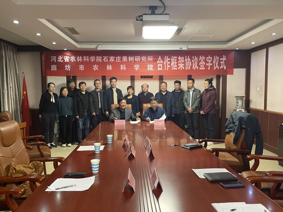 龐昭進所長、褚鳳杰書記、董輝副所長帶領所內相關果樹專家及科技管理人員出席了此次簽約儀式。廊坊市農林科學院院長陶春來、副院長杜德玉和梅仕能、科研管理處及相關業務所人員參加了此次簽約儀式。