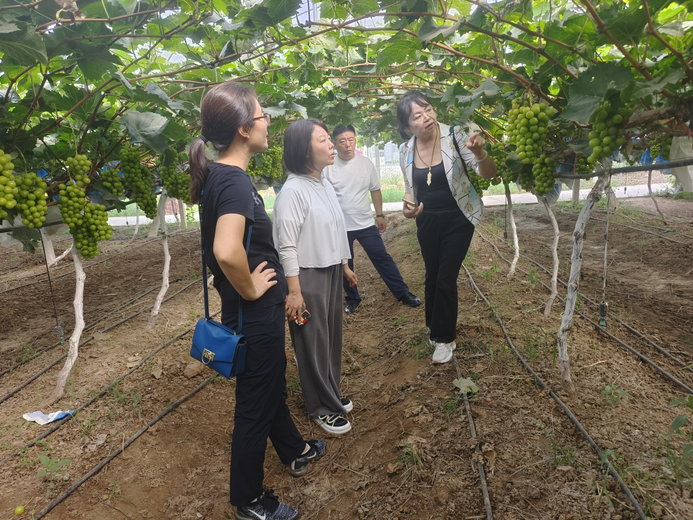 在葡萄研究室主任、石家莊葡萄綜合試驗站站長楊麗麗及團隊成員的陪同下,吳江老師和魏靈珠老師參觀了我所葡萄示范園,雙方在葡萄栽培、品種選育、體系合作等方面進行了交流,并就‘天工墨玉’在河北的推廣達成合作意向。隨后,兩位老師參觀了我所位于正定東房頭村的陽光玫瑰葡萄種植基地,就‘陽光玫瑰’在河北的產銷情況進行了交流。