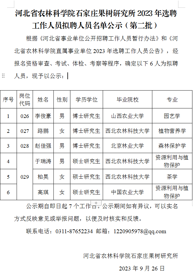 河北省農林科學院石家莊果樹研究所2023年選聘工作人員擬聘人員名單公示(第二批)