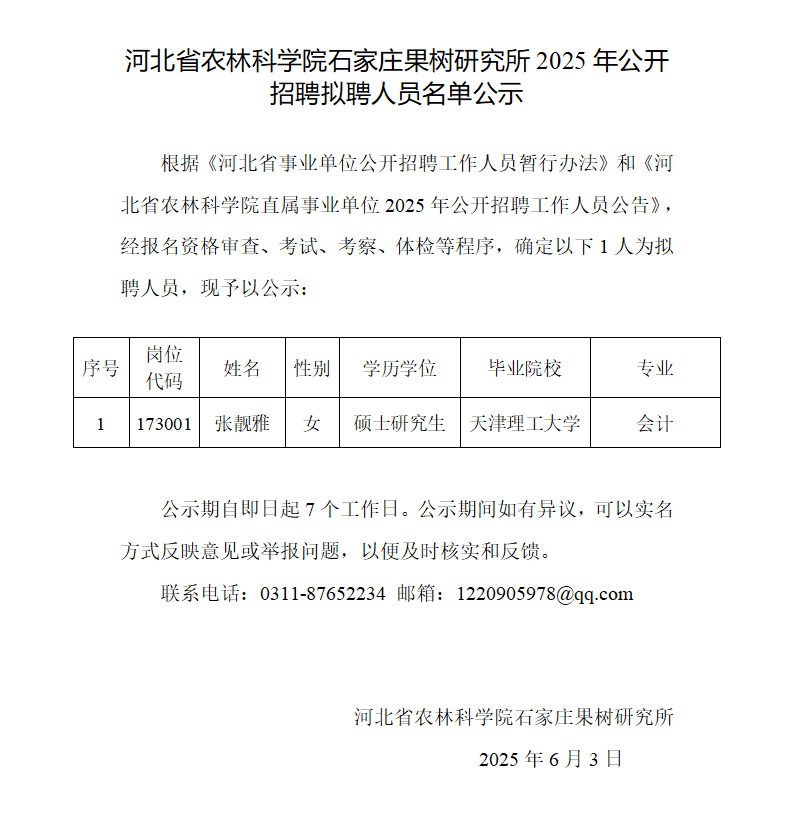 河北省農林科學院石家莊果樹研究所2025年公開招聘擬聘人員名單公示