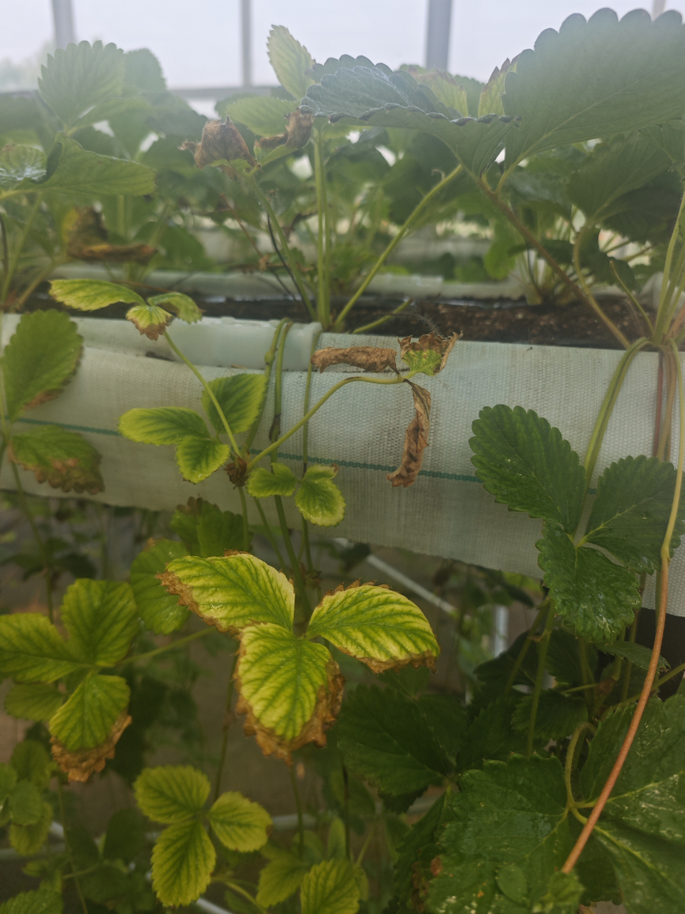 楊雷研究員一行進(jìn)行實(shí)地查看后,發(fā)現(xiàn)許多品種均出現(xiàn)了鹽堿危害癥狀,實(shí)地檢測了灌溉水、育苗槽內(nèi)基質(zhì)的EC和pH值及排液的EC和pH值,結(jié)果顯示EC及pH值均過高。根據(jù)草莓的生長狀況及現(xiàn)有的設(shè)施情況,專家團(tuán)隊(duì)在母株管理、扦插時(shí)間、基質(zhì)環(huán)境及設(shè)施溫濕度調(diào)控等方面提出了指導(dǎo)意見。由于當(dāng)?shù)毓喔人畃H及EC值過高,且公司基質(zhì)育苗量較大,為保證扦插后水和基質(zhì)的EC及pH值在合理范圍內(nèi),建議安裝凈水設(shè)備及對灌溉水進(jìn)行調(diào)酸,確保扦插成活率。
