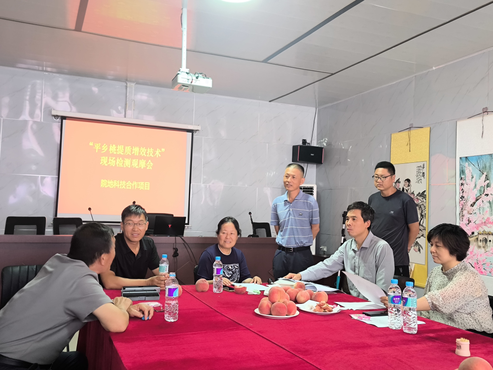 2025年7月18日,我所就承擔(dān)的院地科技合作項目“平鄉(xiāng)桃提質(zhì)增效技術(shù)”,在邢臺市平鄉(xiāng)桃基地召開現(xiàn)場檢測觀摩會,會議邀請了省農(nóng)業(yè)農(nóng)村廳特色產(chǎn)業(yè)技術(shù)指導(dǎo)總站劉敏彥研究員、河北科技師范學(xué)院武軍凱教授、邢臺市農(nóng)業(yè)科學(xué)研究院李林英研究員作為專家進(jìn)行現(xiàn)場檢測,平鄉(xiāng)縣董輝副縣長、農(nóng)業(yè)農(nóng)村局鄭曉娜局長及石家莊果樹研究所、平鄉(xiāng)桃基地有關(guān)人員出席參加。