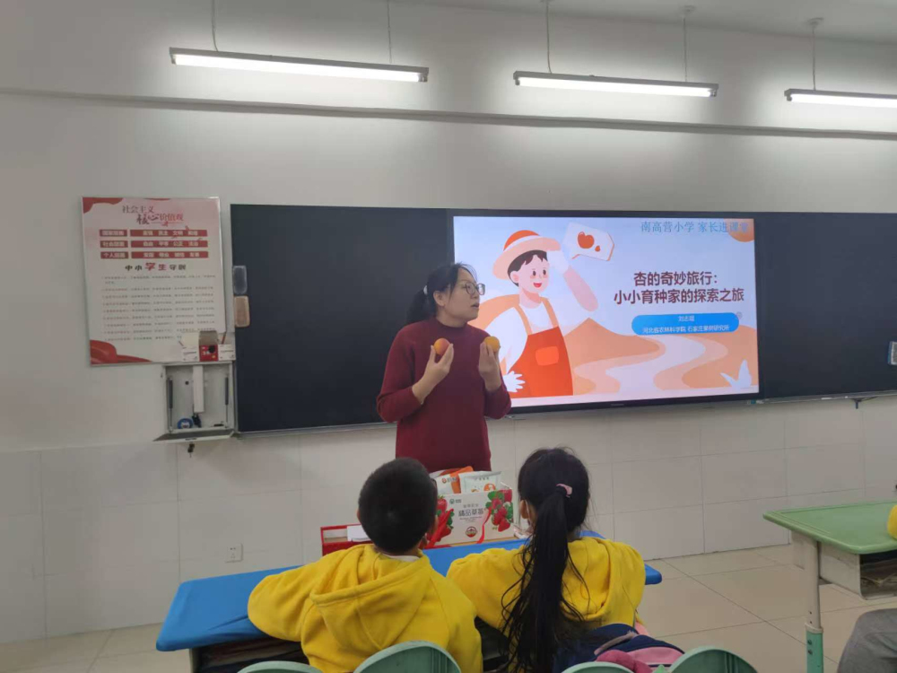 活動(dòng)現(xiàn)場(chǎng),我所劉志琨副研究員以生動(dòng)有趣的講解,帶領(lǐng)四年級(jí)9班的師生們開(kāi)啟杏樹(shù)探索之旅。從杏樹(shù)2600余年的種植歷史、中國(guó)故鄉(xiāng)淵源及環(huán)球傳播歷程,到“杏壇”“杏林”的文化內(nèi)涵,再到杏果與杏仁的豐富營(yíng)養(yǎng)價(jià)值,劉志琨用趣味提問(wèn)、文化典故拉近距離。針對(duì)“杏樹(shù)育種”這一核心內(nèi)容,她以“牽紅線(xiàn)”“水果魔術(shù)師”等形象比喻,通俗解讀人工授粉、基因選擇等專(zhuān)業(yè)知識(shí),并通過(guò)實(shí)物模型展示金荷、冀早紅等杏樹(shù)新品種,讓學(xué)生直觀感受育種科技的魅力。